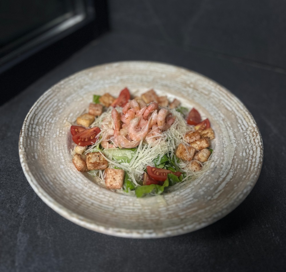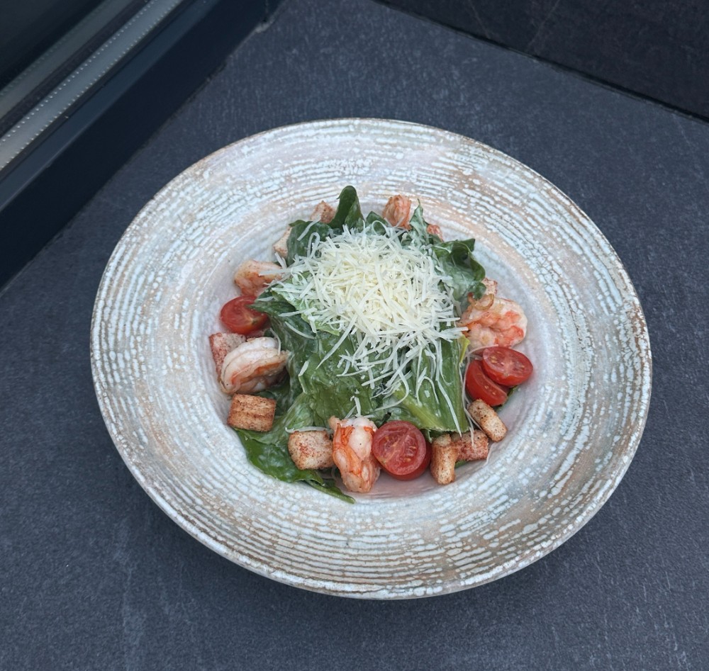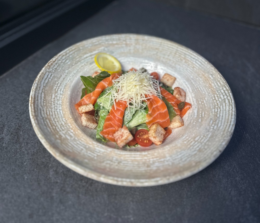 - ▶ Склад: салат ромен, соус цезар, яйце перепелине, чері, куряча грудинка су-від, крафтовий бекон, французький багет.
