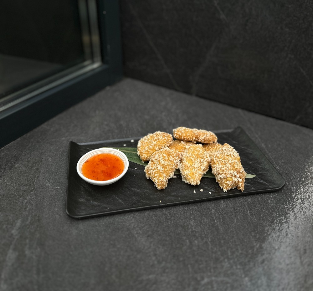 - ▶ Склад: тісто крафтового виробництва, начинка з філе курячого бедра, цибуля зелена, пекінська капуста маринована в білому вині та кунжутній олії, подається з тайським соусом та перцем чілі.
