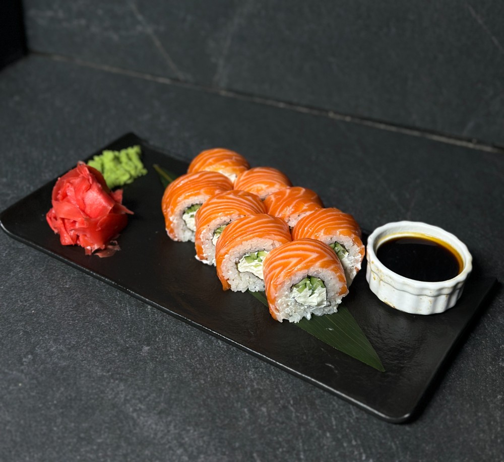 - ▶ Склад: рис, крем - сир, лосось, огірок, норі, васабі, імбир, соєвий соус.